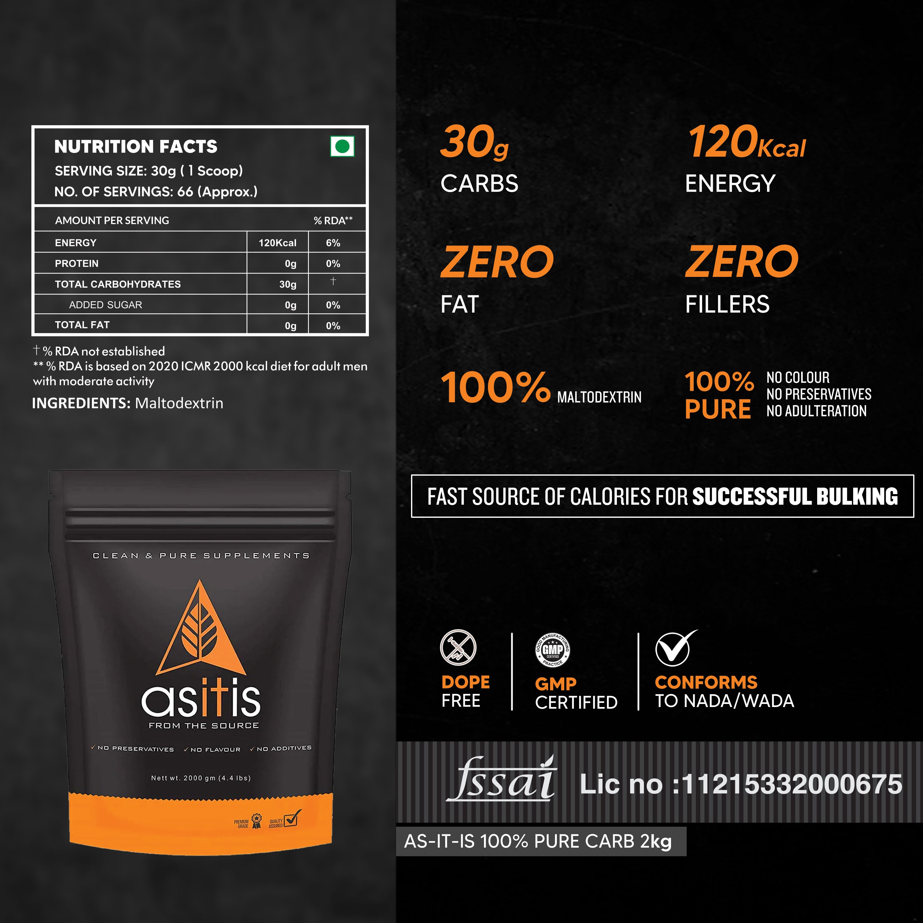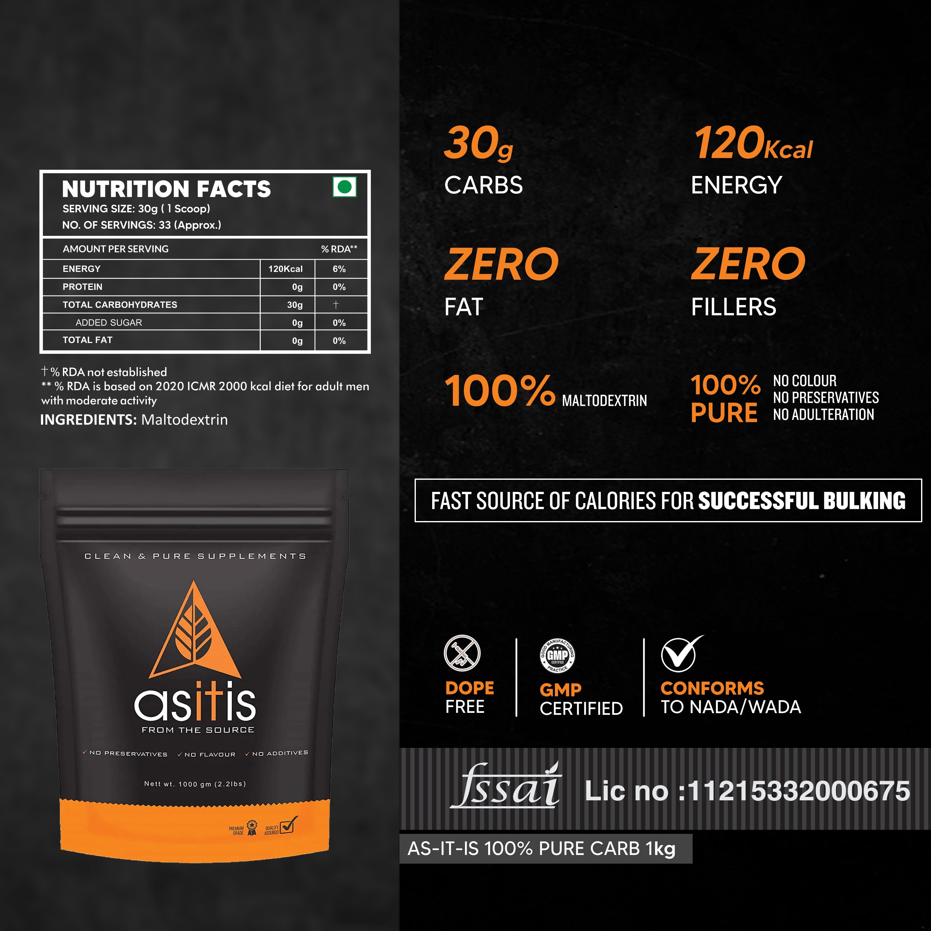 AS-IT-IS pure carb contains 100% maltodextrin, which is a polysaccharide made from non-GMO corn.