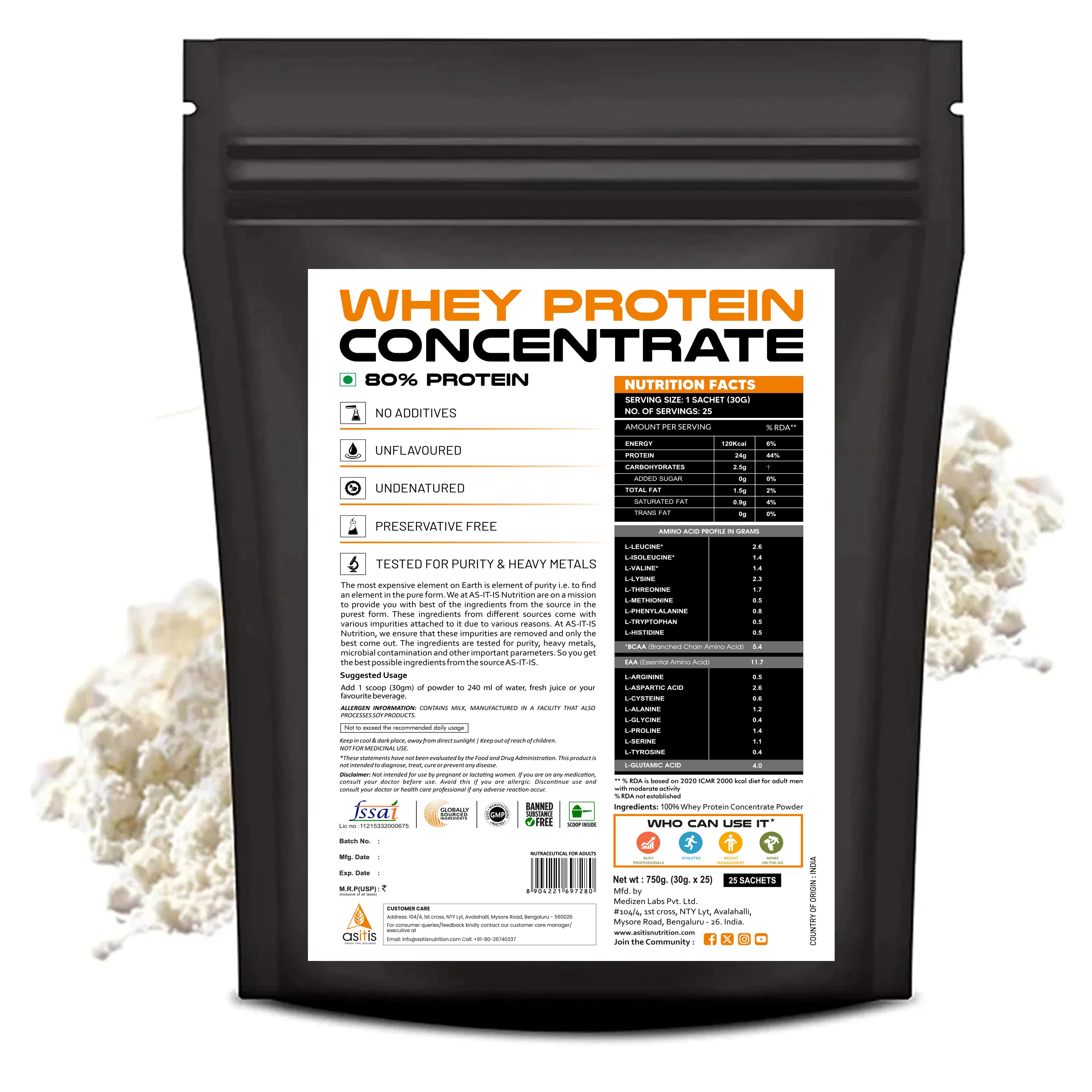AS-IT-IS Whey Protein sachet contains unflavoured Whey Protein Concentrate, which provides 80% protein.