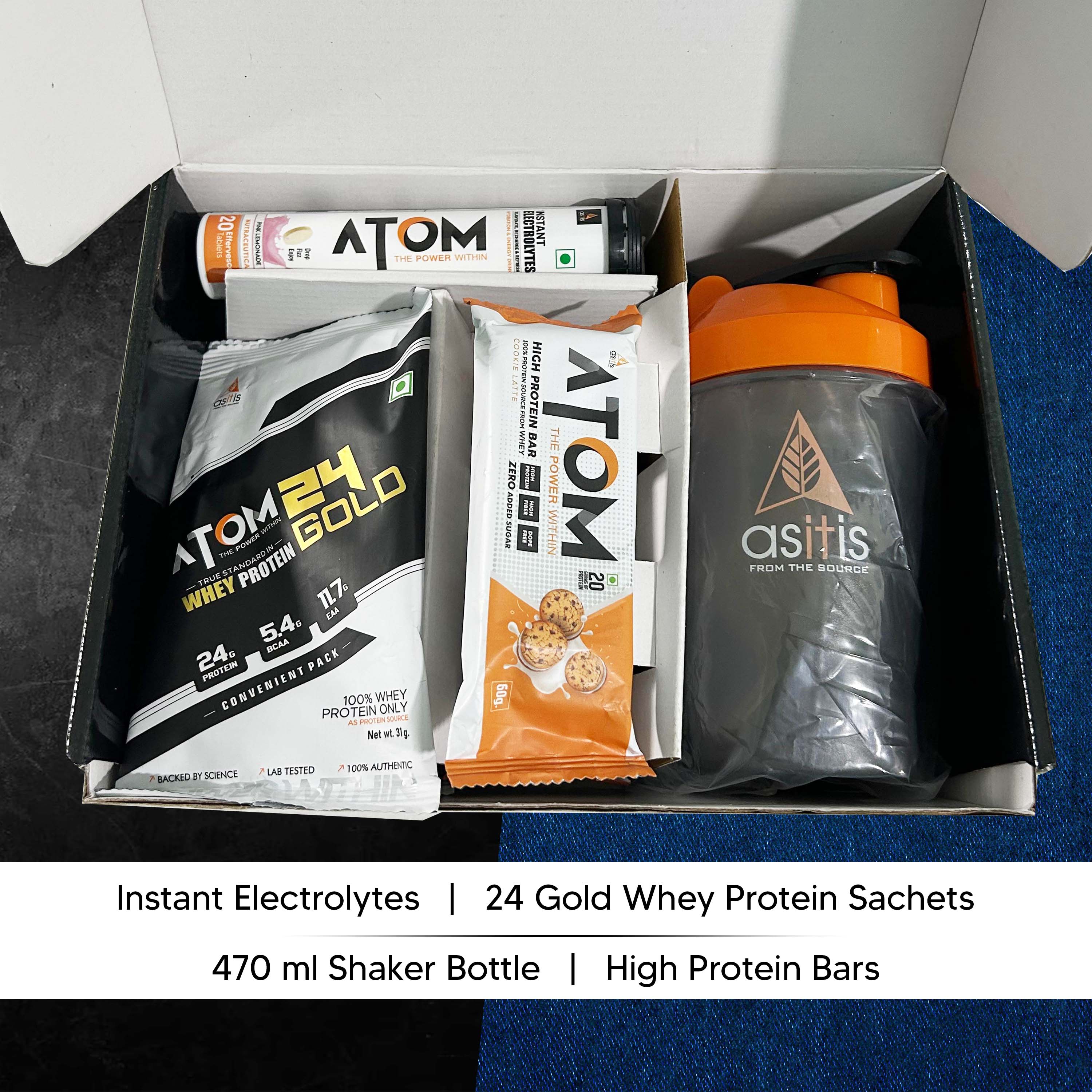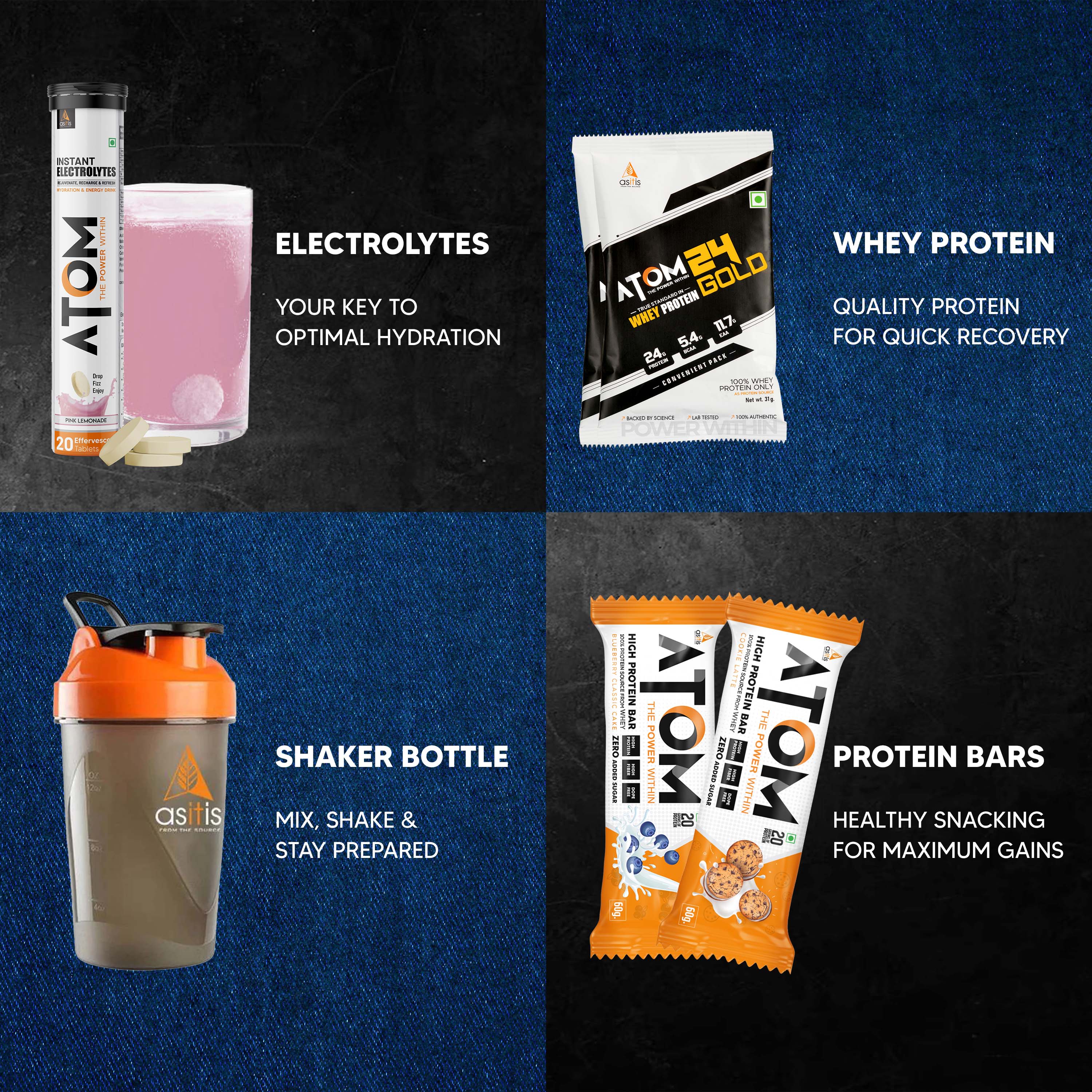 AS-IT-IS ATOM Passport to Fitness, Beginners Kit with Whey Protein, Electrolyte Effervescent, Shaker, Protein Bars - Combo Pack