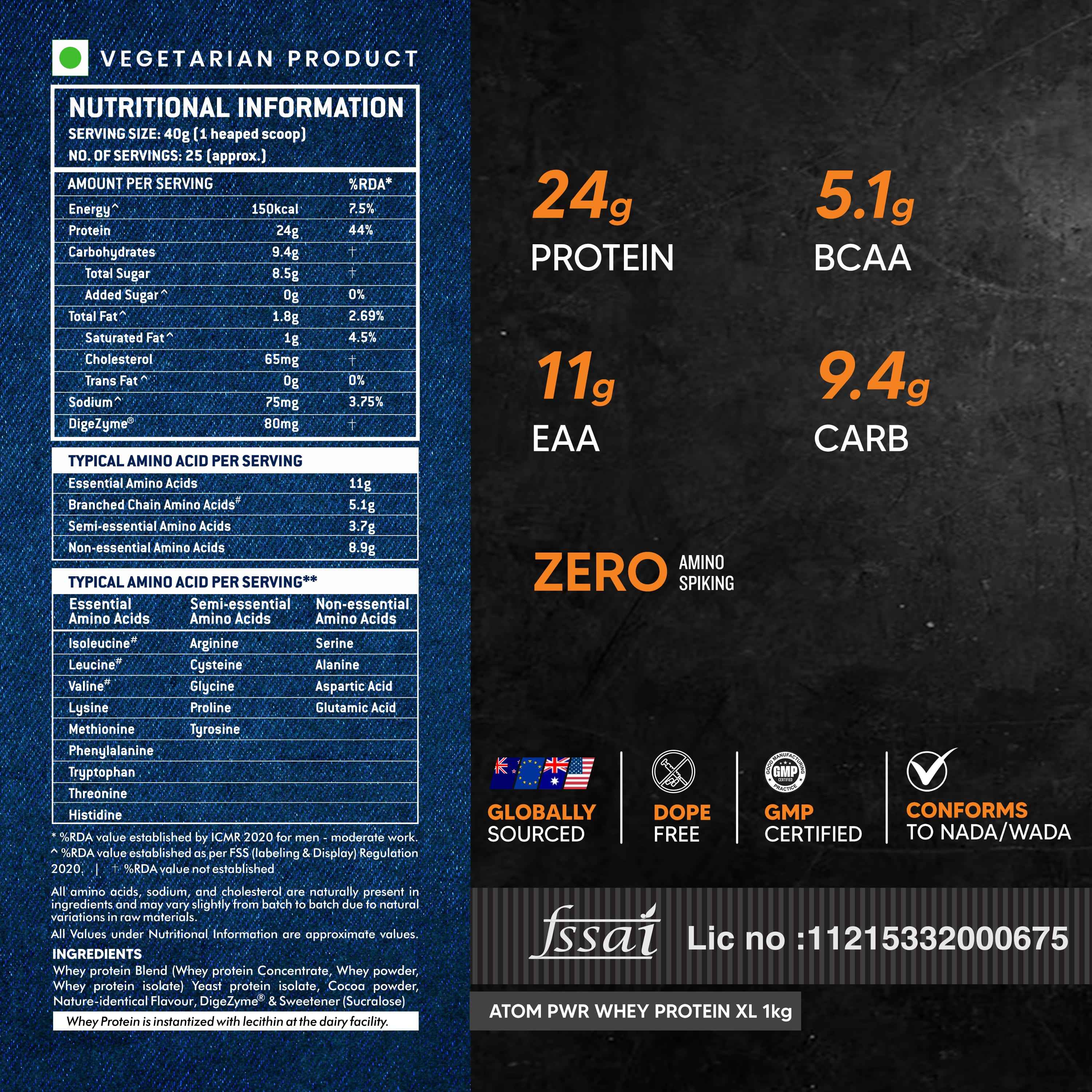 ATOM PWR Whey Protein XL is a high-quality whey protein supplement designed to support muscle growth, recovery, and overall performance. It delivers 24g of protein per serving, is rich in essential amino acids, and includes DigeZyme®.