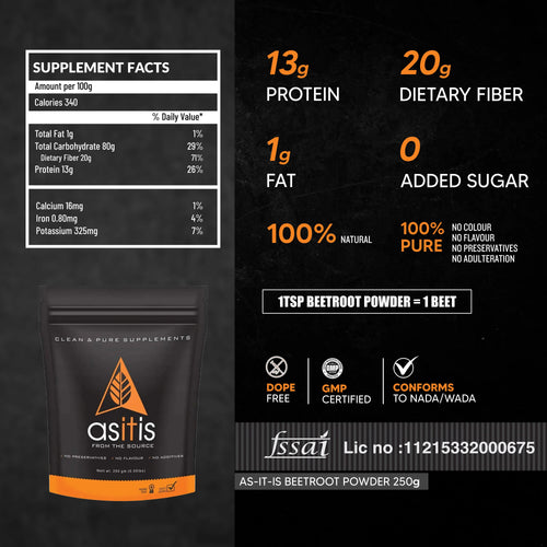 Beetroot powder is nothing but the powdered form of beets. The root of the plant Beta Vulgaris is used to make this herbal powder. Beetroot powder is obtained from dried (dehydrated) beetroots by grinding them or milling them. Beets are a rich source of fiber, folate, potassium, phytochemicals, bioactive compounds like betalains, flavonoids, polyphenols, and saponins. Beetroots are nutritionally dense and are health-promoting functional food. Beetroots have a high content of dietary nitrate, which the body converts to biologically active nitric oxide. Beetroot powder is versatile, convenient, nutritionally dense, just a teaspoon of beetroot powder is equivalent to an entire beet. The use of beetroot powder is a great way to avail the health-promoting benefits of the veggie. AS-IT-IS beetroot powder is 100% pure, natural, raw, free of preservatives, chemicals, and has exceptional nutritive value.