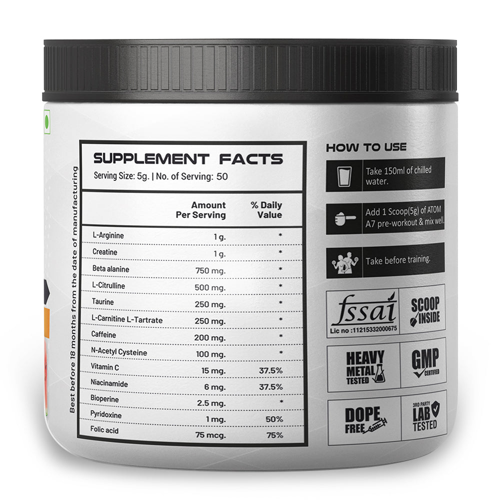 ATOM A7 Pre-workout with Caffeine, L-arginine, Creatine, Beta-alanine | Watermelon Flavour